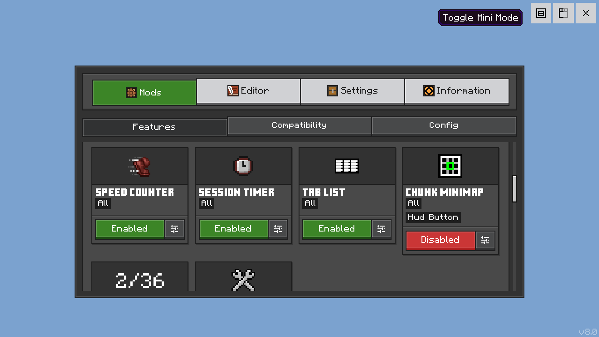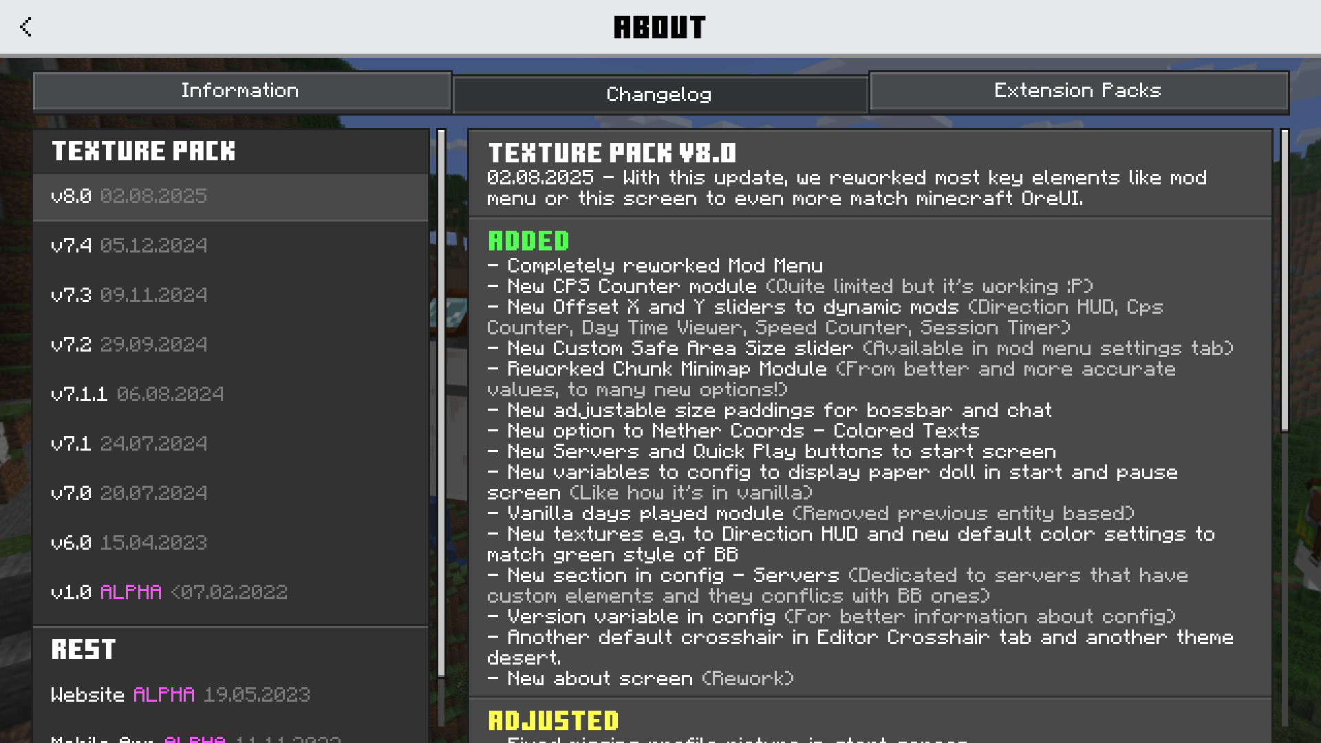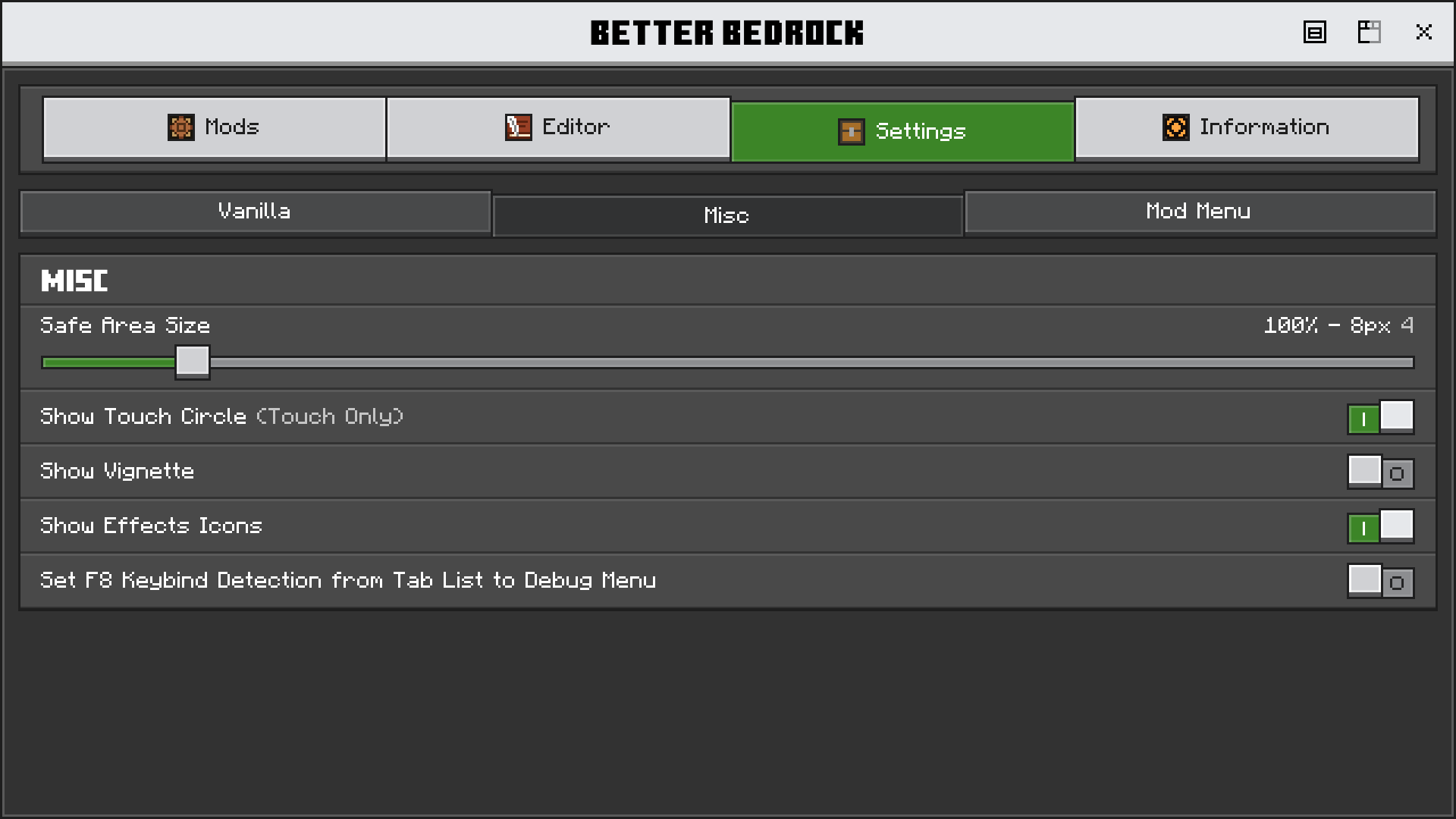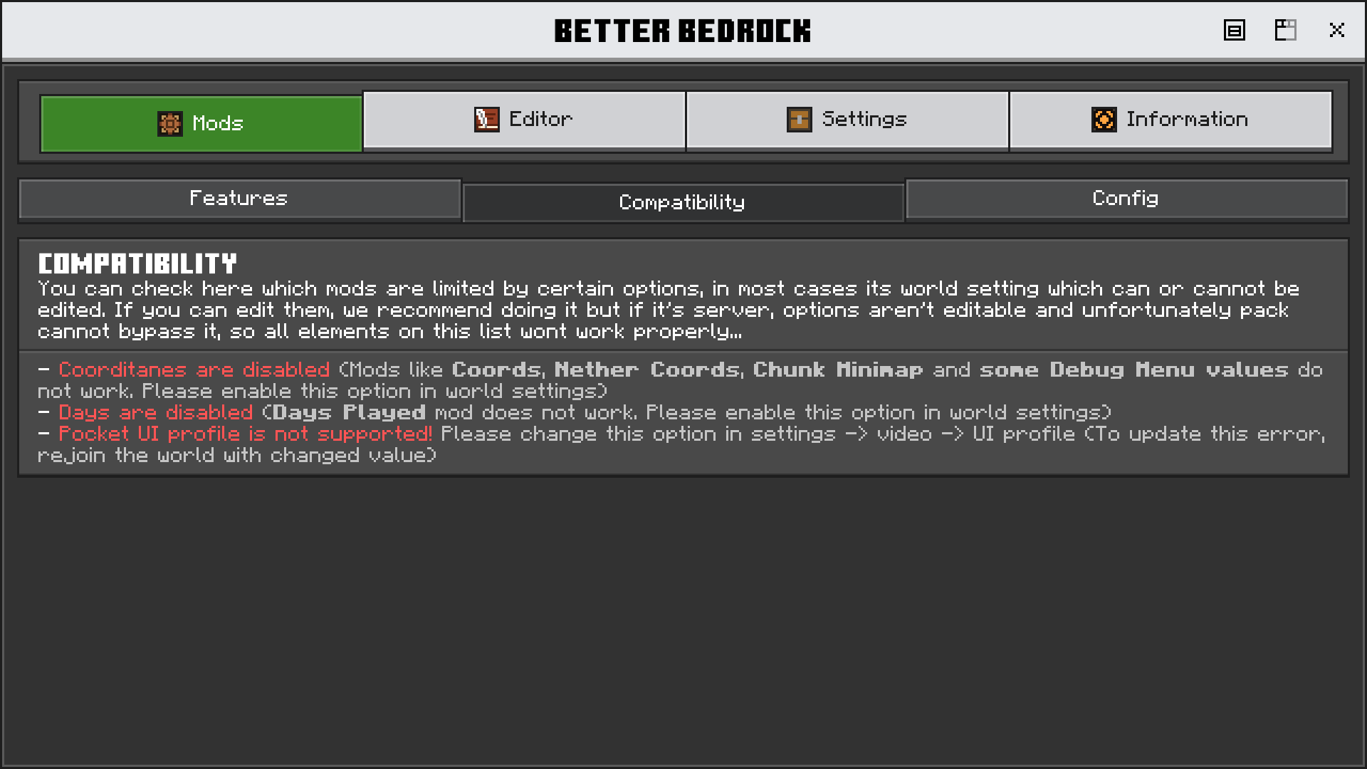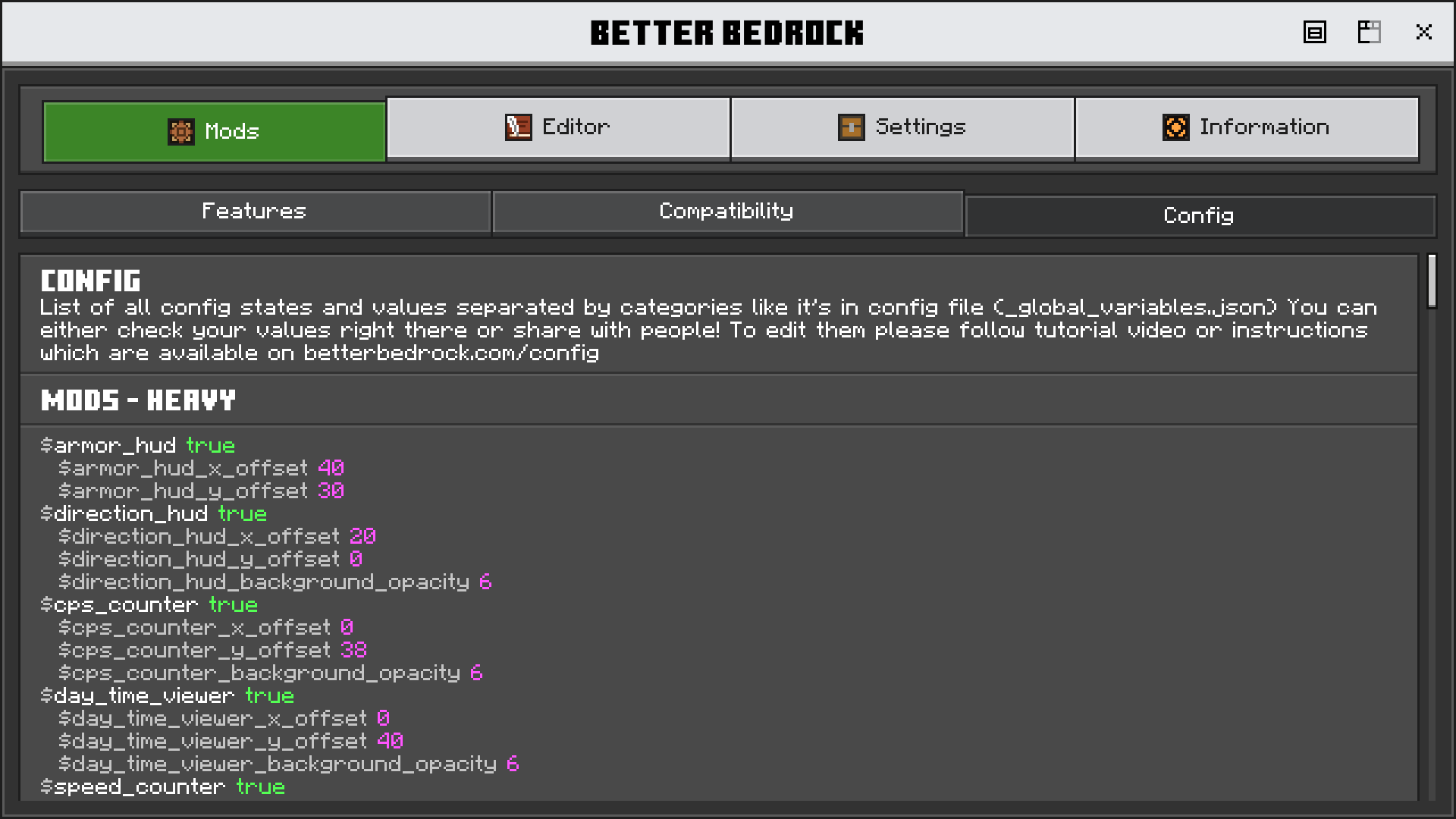 Place where you can find key mods of Better Bedorck and adjust their options. With Extra Tabs like Compatibility and Config, you can find possible issues or check your configuration.