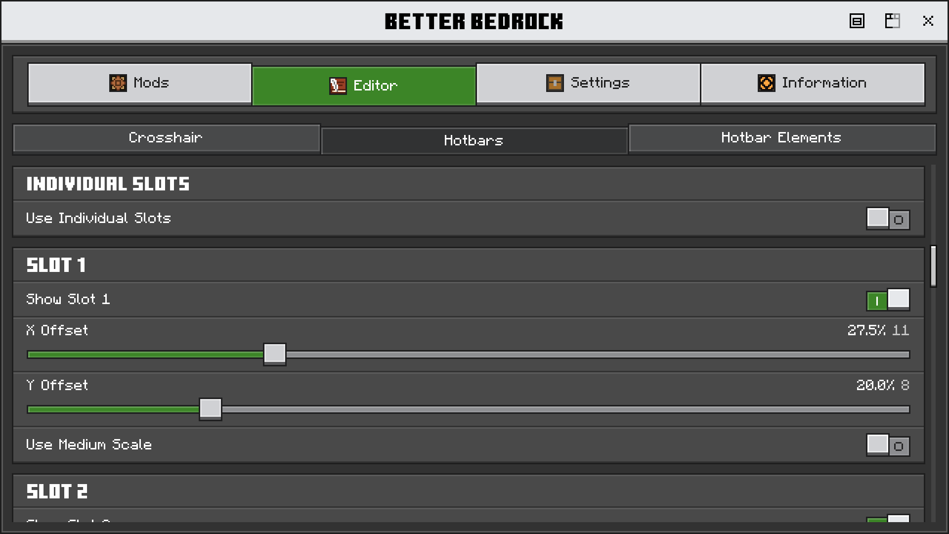Change your crosshair image, color or size! Completely adjust hotbar slots and their elements - powerful feature for touch users!