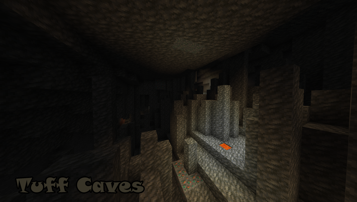 Tuff Caves: a cave made of tuff, with many spikes. It can be dangerous to traverse. Iron and copper are more common here!