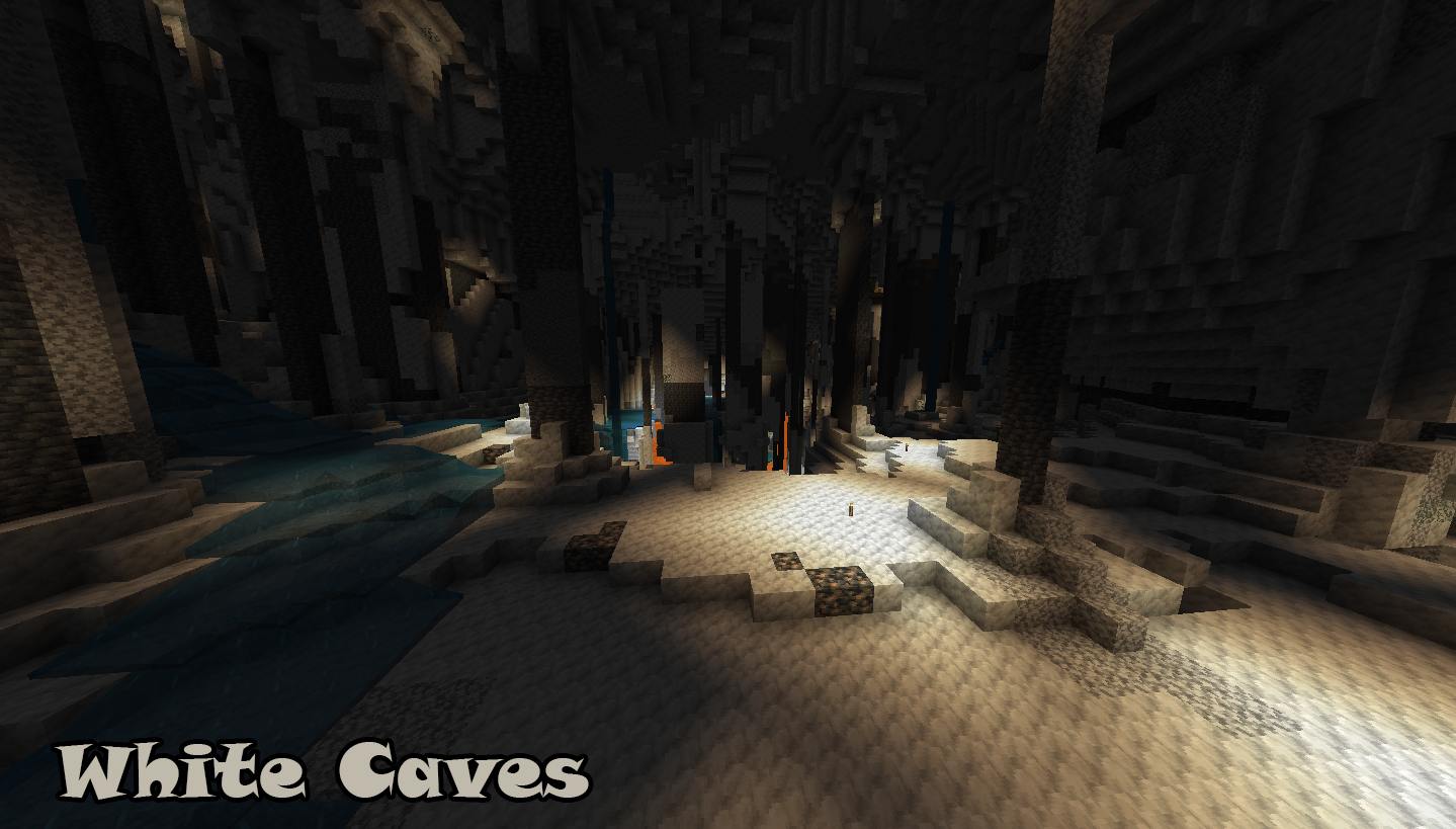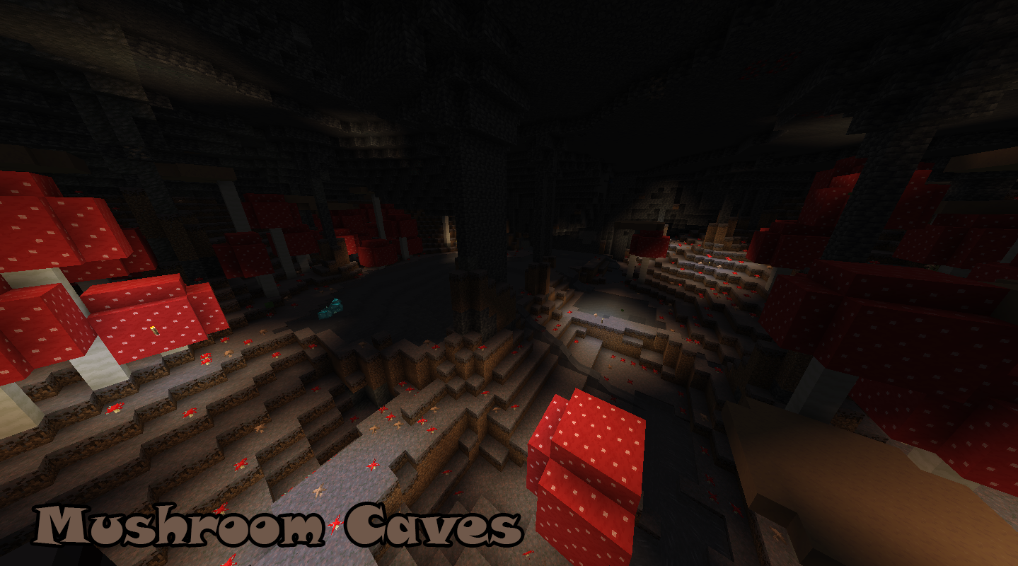 White Caves: a cave made of diorite and calcite. There are large quantities of iron here!Swamp Caves: wild caves with oak trees and giant red mushrooms; sometimes patches of water can appear!