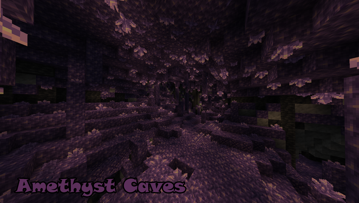 Amethyst Caves: a biome that resembles a giant geode, filled with Amethyst Clusters and Amethyst Buds. Monsters don't spawn here!